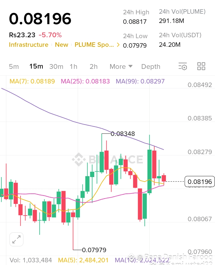 The market is heating up! 🔥 After dipping to $0.07979, PLUME made a strong bounce and touched $0.08348, showing signs of quick recovery. Right now, price is at $0.08196, slightly below the 99 MA line – this is the critical level to watch!