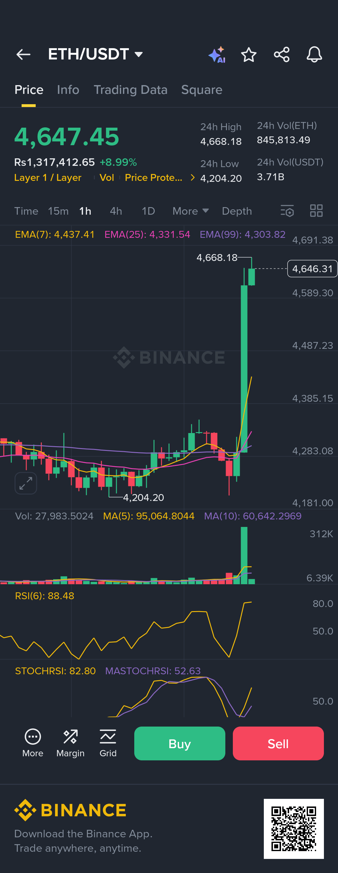 Ethereum a crescut cu aproape +9% în ultimele 24h, sărind de la minime de $4,204 la un maxim de $4,668, acum menținându-se puternic la $4,647. Spargerea a împins ETH bine deasupra nivelurilor cheie EMA, semnalizând un impuls bullish puternic. Cu toate acestea, RSI și StochRSI indică faptul că piața intră în zona supracumpărată, crescând riscul unei corecții pe termen scurt înainte de continuare.
