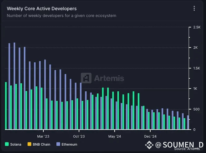 BNB Chain shows consistently low developer interest.