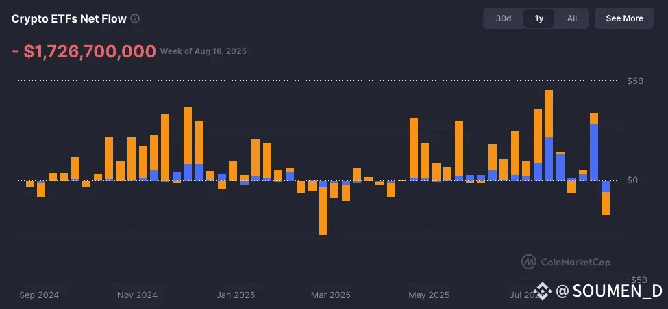 ETH ETF inflows have been steadily rising since mid-July, aligning with ETH’s breakout (+60% rally). Institutional flows are confirming Ethereum’s re-emergence as the market’s growth leader.