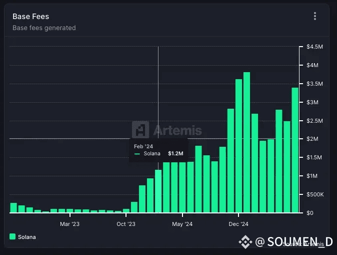 Solana base fees surged sharply in late 2023 and stayed elevated through 2024–2025.