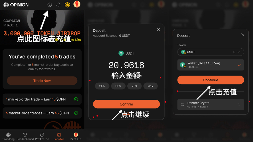 第4步:进行充值,充值20u以上即可,步骤如下