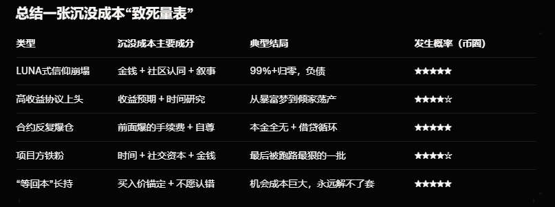 币圈沉没成本最狠的地方在于:它不光让你亏钱,还让你把时间、精力、社交关系、家庭都继续押进去,形成多重锁定。