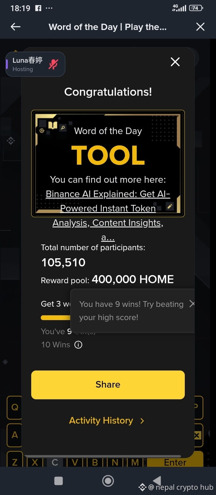 ट्रेडिङको यो तनावपूर्ण समयमा बाइन्यान्सको 'Word of the Day' मेरो लागि एउटा राम्रो 'Mind Refreshment' गेम बनेको छ। यस हप्ताको AI Innovation थिम अन्तर्गत 'TREND' र 'TOOL' जस्ता शब्दहरू सही अनुमान गर्दै आज मैले ९ औँ जित (9 Wins) पुरा गरेको छु! ४००,००० HOME टोकनको रिवार्ड पूलमा सहभागी हुन अब मलाई मात्र एक जित बाँकी छ।