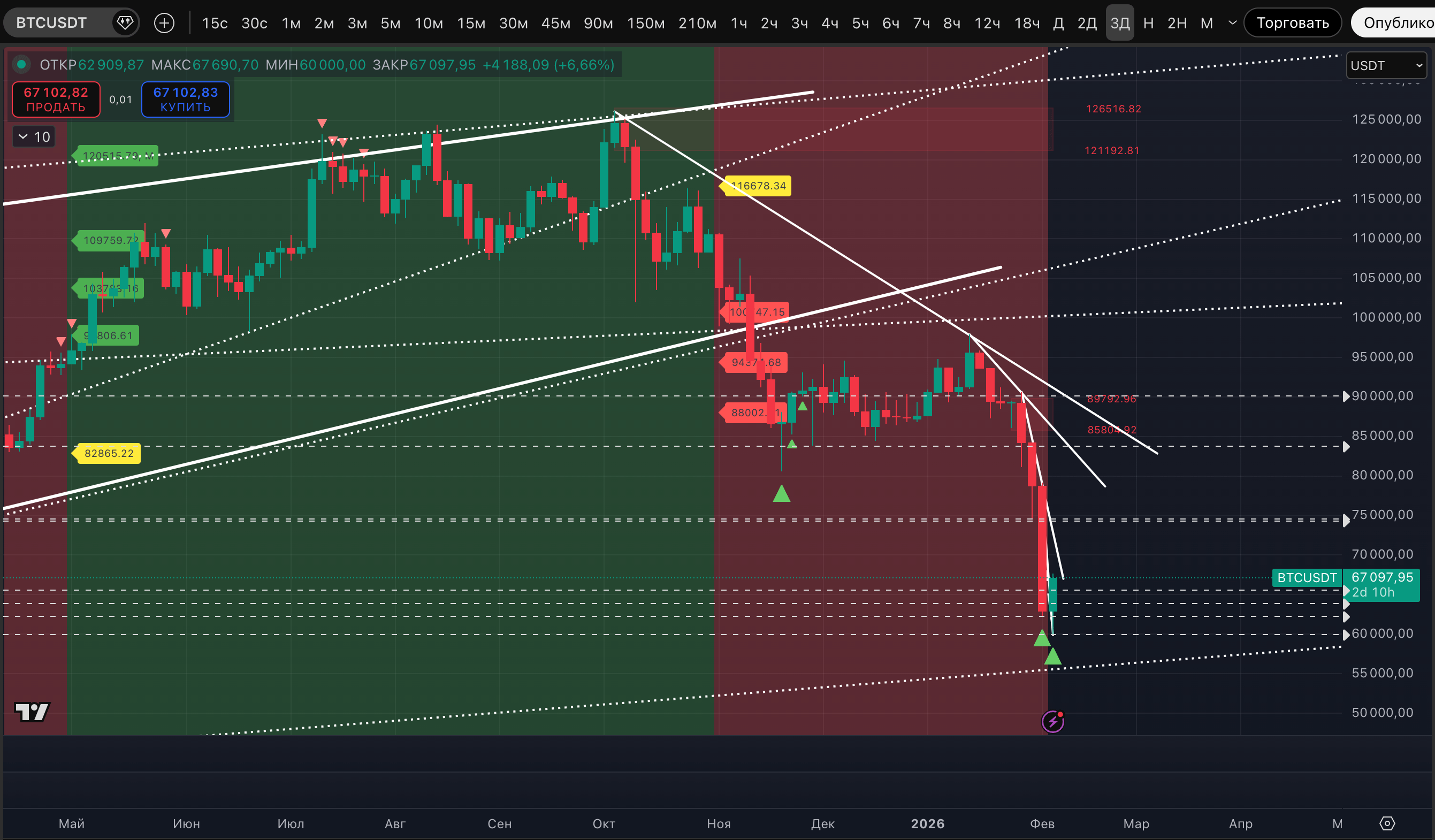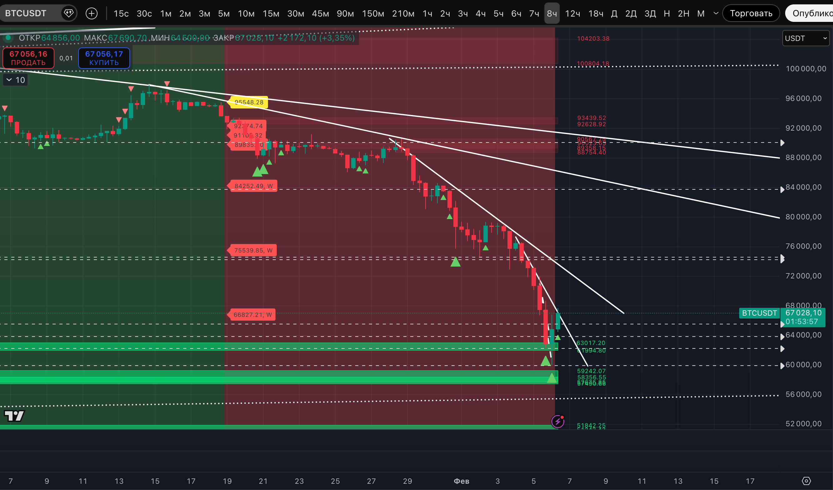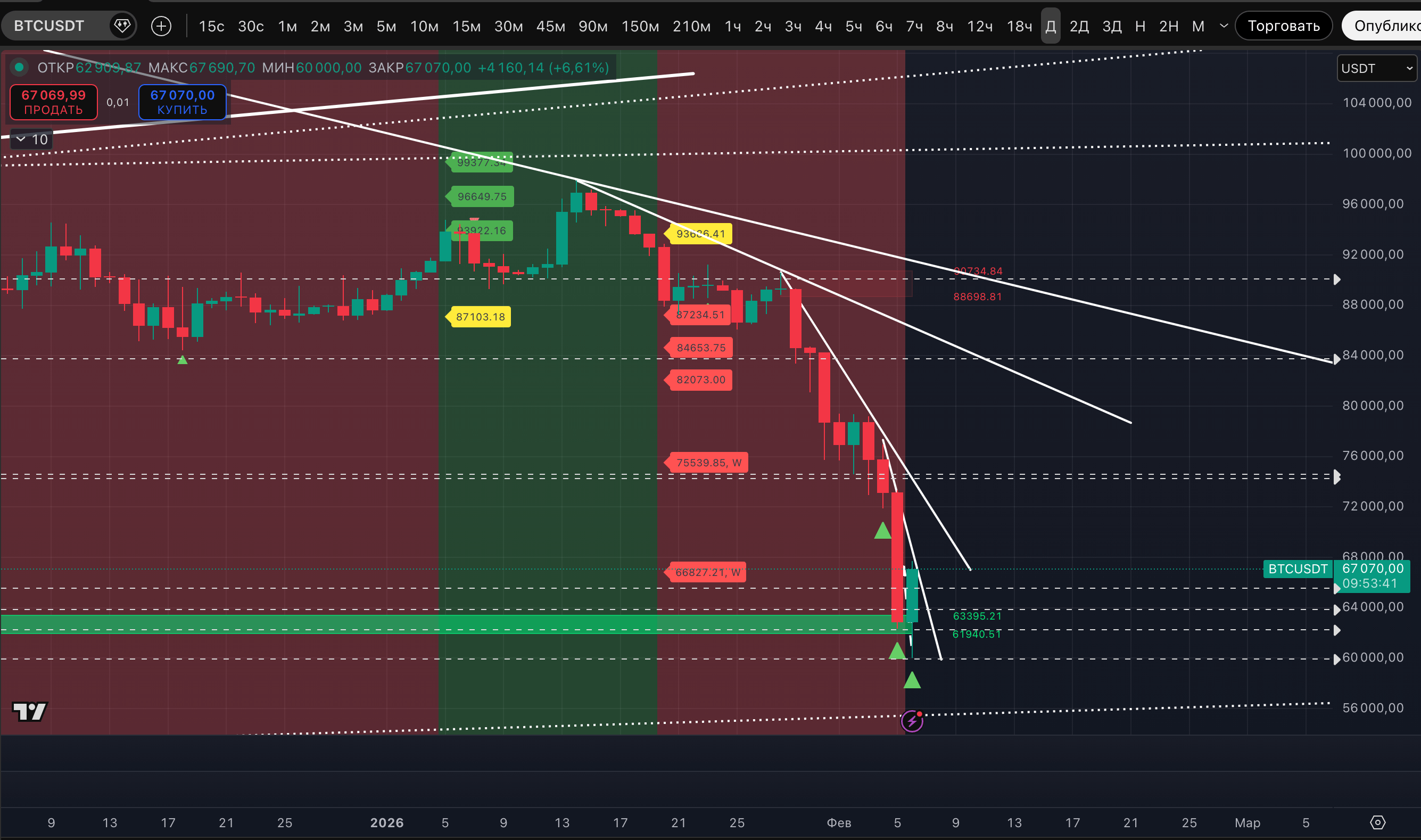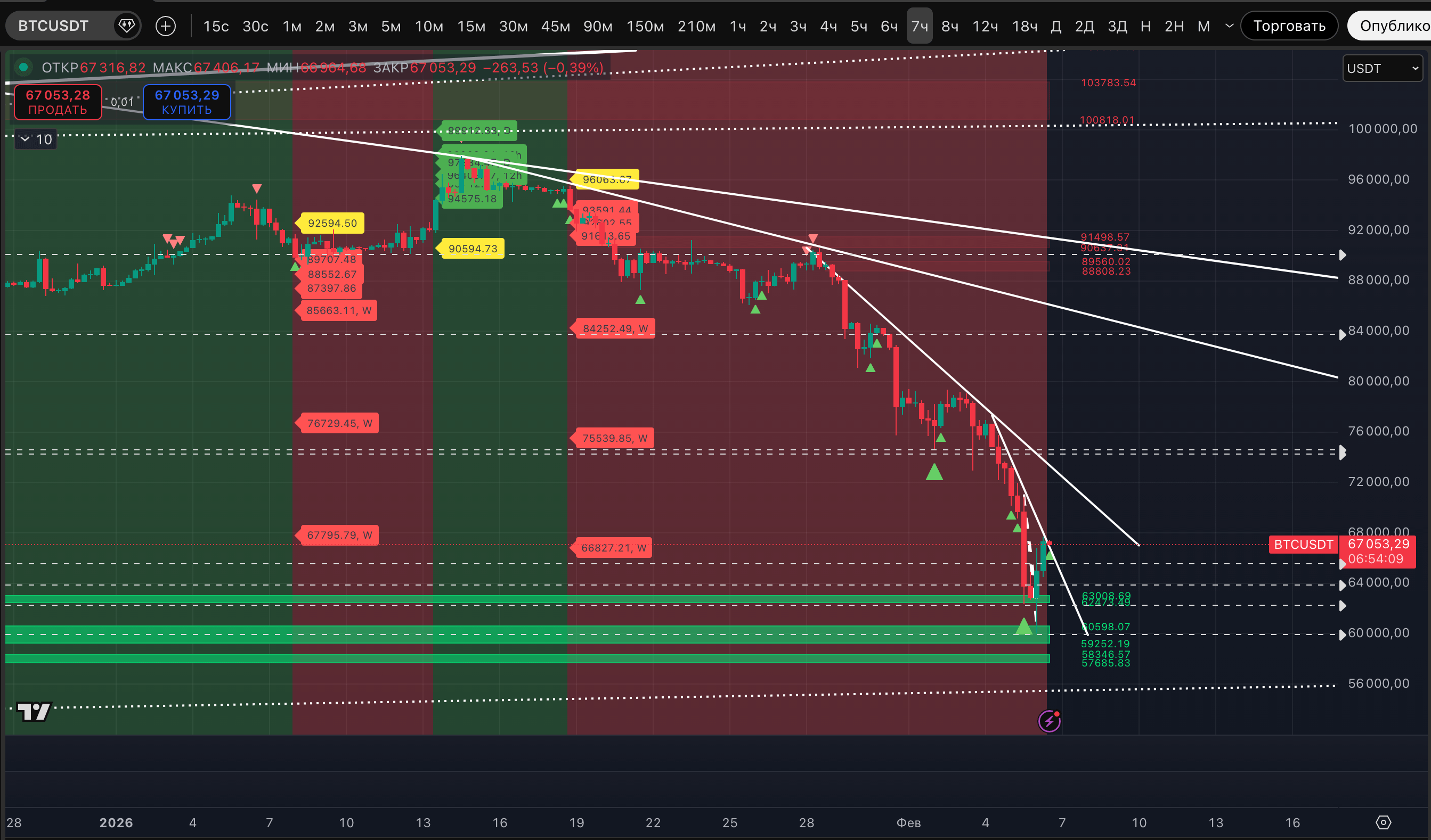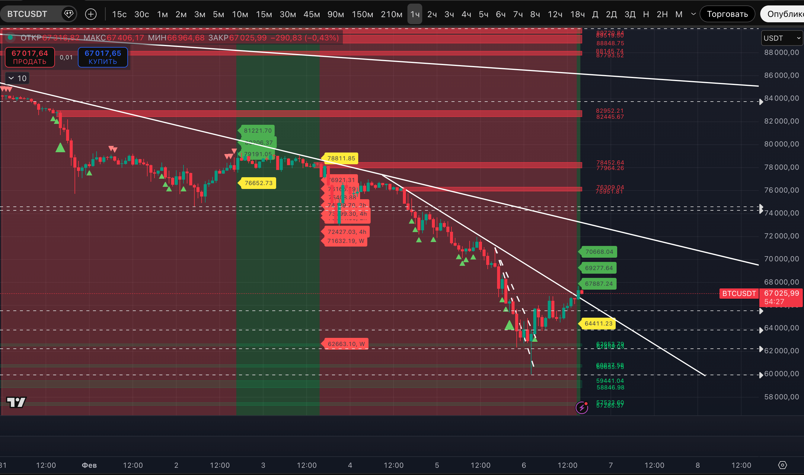 Minus pentru așteptatul (din nou) rebound - ceea ce este în față este weekendul și creșterea activă va lăsa un gap. În general, reboundul a început deja - de la minimul de 60 000$ creșterea este de +12,7%. Pur și simplu, după un astfel de dump, se cere o mișcare mai semnificativă. Măcar către câteva zone de lichiditate apropiate, care pe TF orar le indică indicatorul nostru. Cea mai apropiată - este 75 951-76 309$.