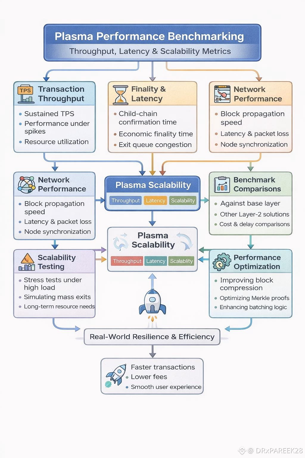 When people talk about Plasma in blockchain, they often stop at “it’s a Layer-2 scaling solution.” But the real story begins when we measure it. Performance benchmarking is where theory meets pressure. Throughput, latency, and scalability are not abstract buzzwords they define whether Plasma can survive real traffic, real users, and real economic activity.