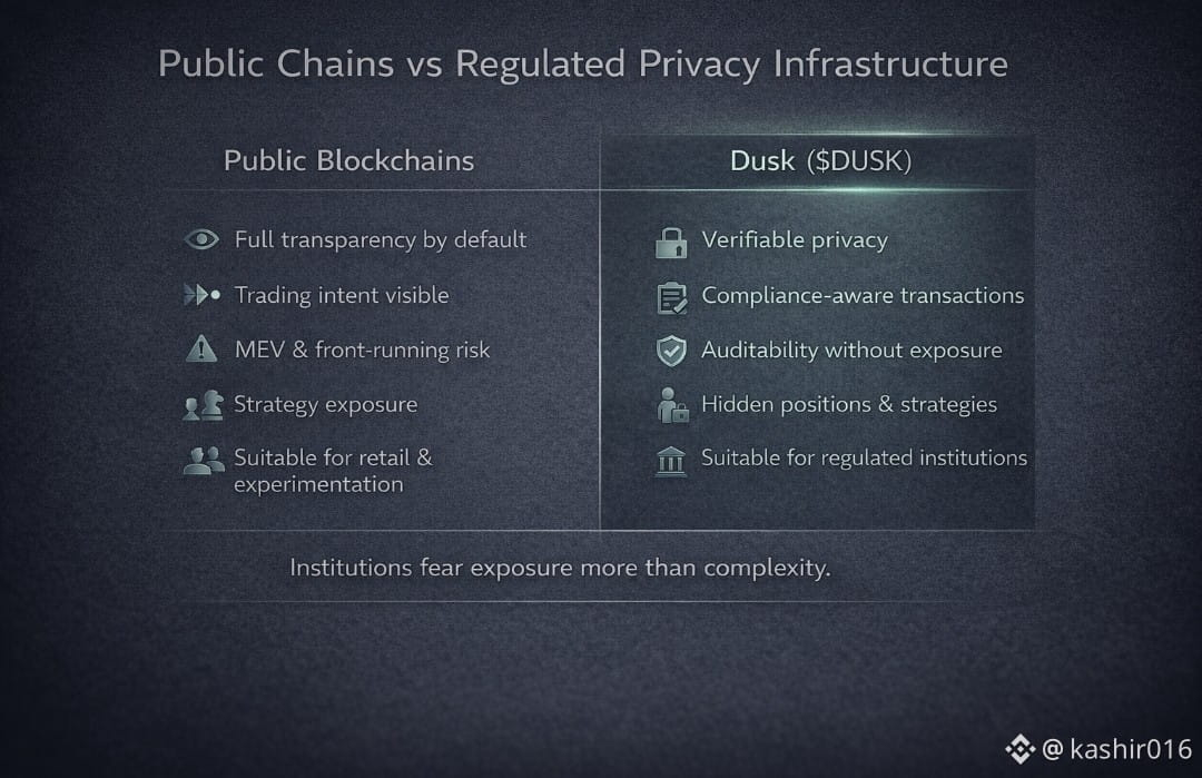This is where Dusk’s design matters. Traditional public chains are transparent by default. That transparency works well for experimentation, but it breaks down the moment serious capital arrives. Strategies leak. Order flow becomes visible. Competitors and bots react before settlement completes. For regulated exchanges and asset issuers, that’s unacceptable.
