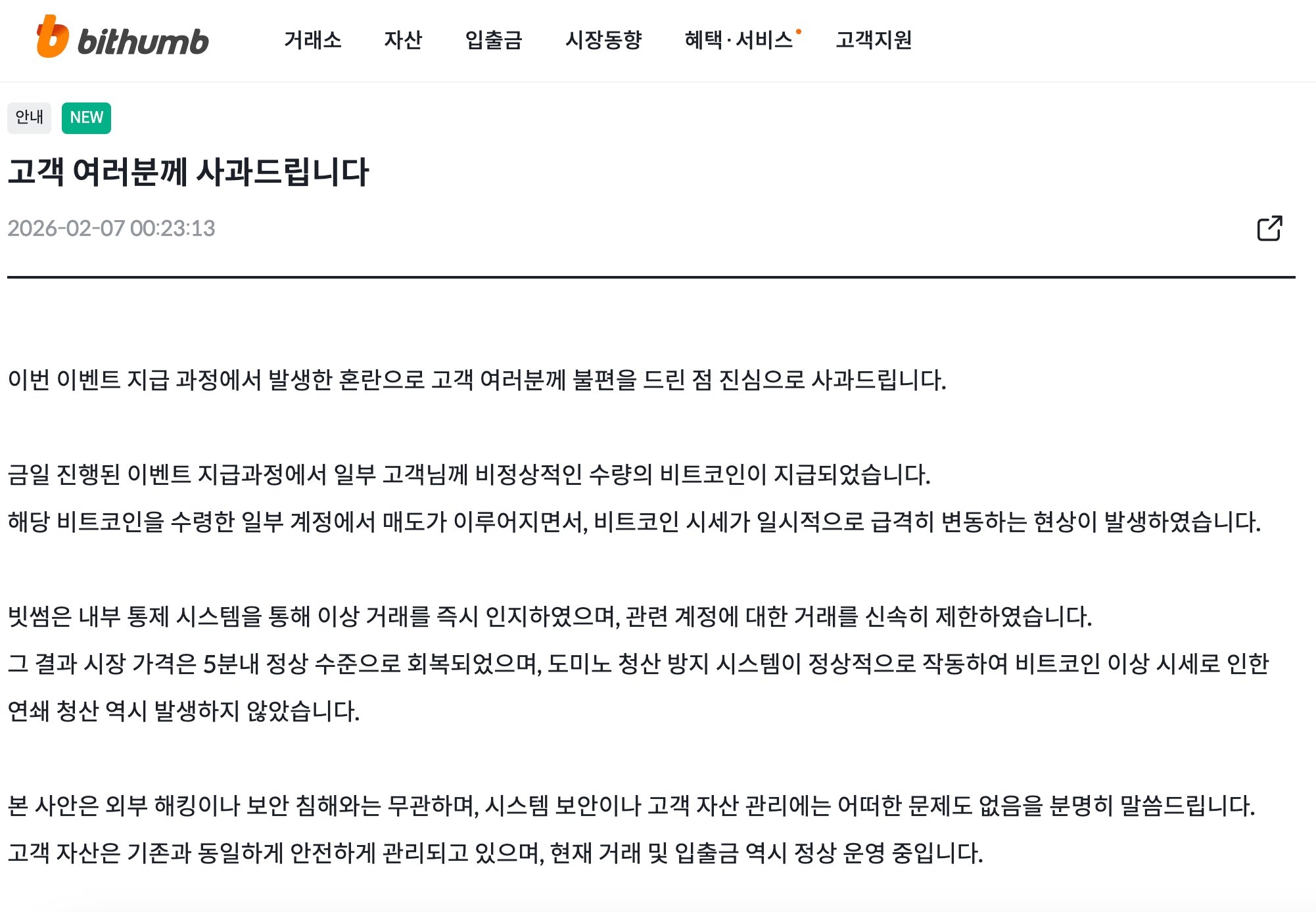 2026 年开年,加密货币交易所 Bithumb 就以一场令人咋舌的操作失误登上头条。该平台今日发布道歉公告,证实因内部失误,误将 2000 枚比特币当作 2000 韩元,以奖励形式发放给部分用户。