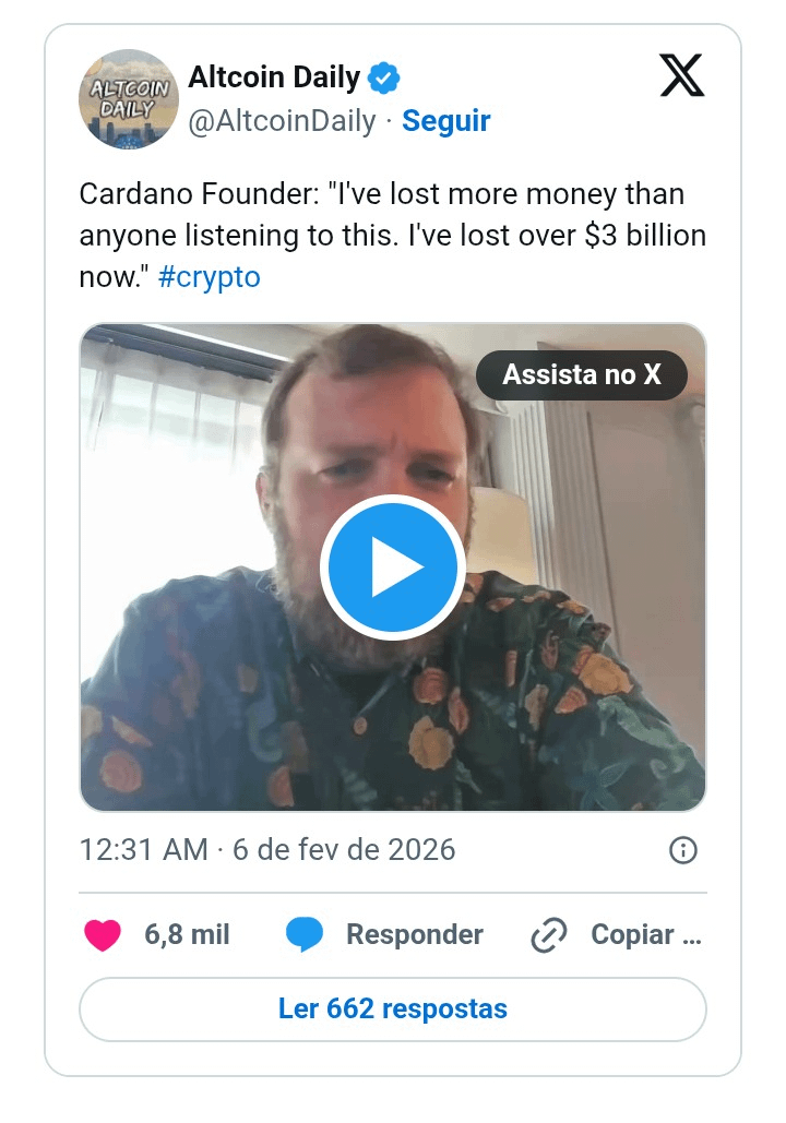 Ô trem bão de contar: o Charles Hoskinson, que é o caboclo que fundou a Cardano, falou que essa derrubada do mercado de cripto já fez ele perder mais de 3 bilhão de dólar nas moedas que tem guardadas. Ele soltou isso ontem (5), lá de Tóquio, numa live.
