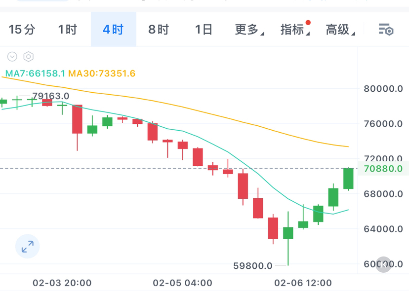 大饼四小时级别迎来企稳反弹,市场抄底情绪持续升温。周五行情快速下探后,大饼从70000附近高位急挫至59800低点,随后展现出强劲的抗跌表现。伴随价格连续收阳反弹,当前已逐步靠近布林带中轨,市场情绪也迎来微妙转变。