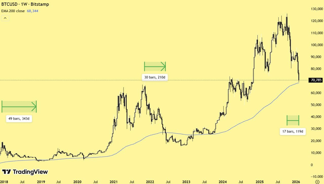 În ciclurile anterioare, Bitcoin a avut întotdeauna nevoie de foarte mult timp pentru a trece de la vârful ciclului la mediana de 200 de săptămâni (200W EMA).
