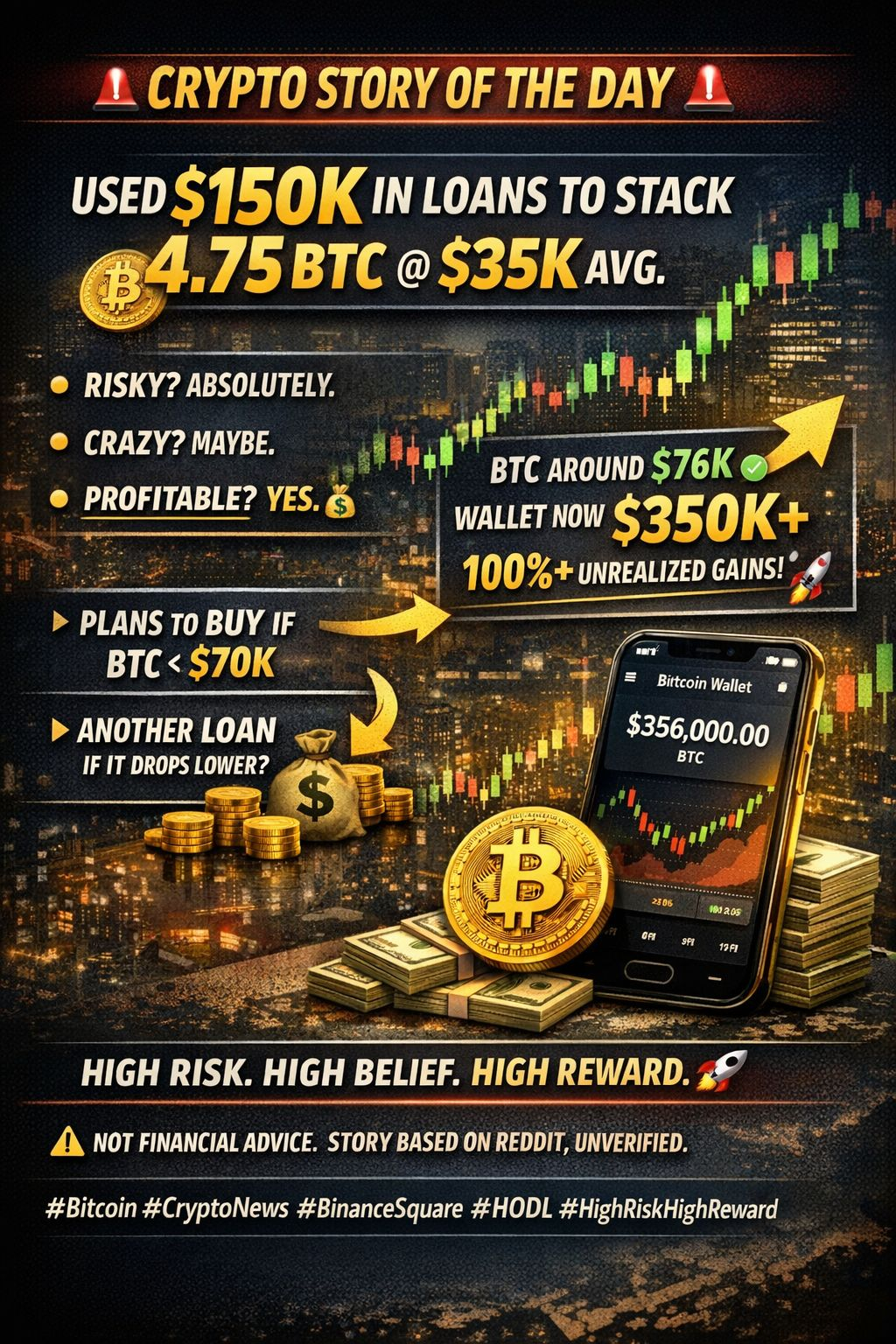 A $BTC holder revealed he used $150K in personal loans over 4 years to stack 4.75 BTC at an average of $35K.