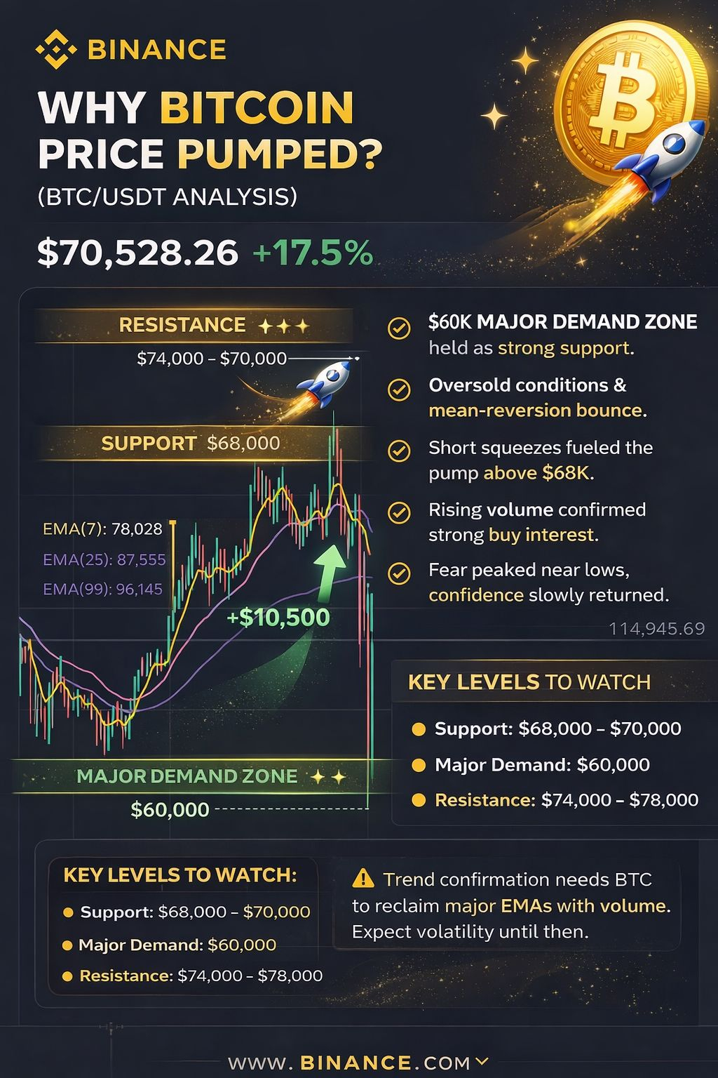 From a market psychology angle, fear peaked near the lows, and once price held above $60k, confidence slowly returned. Traders who missed previous dips jumped back in, while long-term holders continued accumulating. Although the broader structure is still recovering, this pump signals that buyers are defending key levels, and BTC may attempt to retest higher resistance zones if momentum holds.