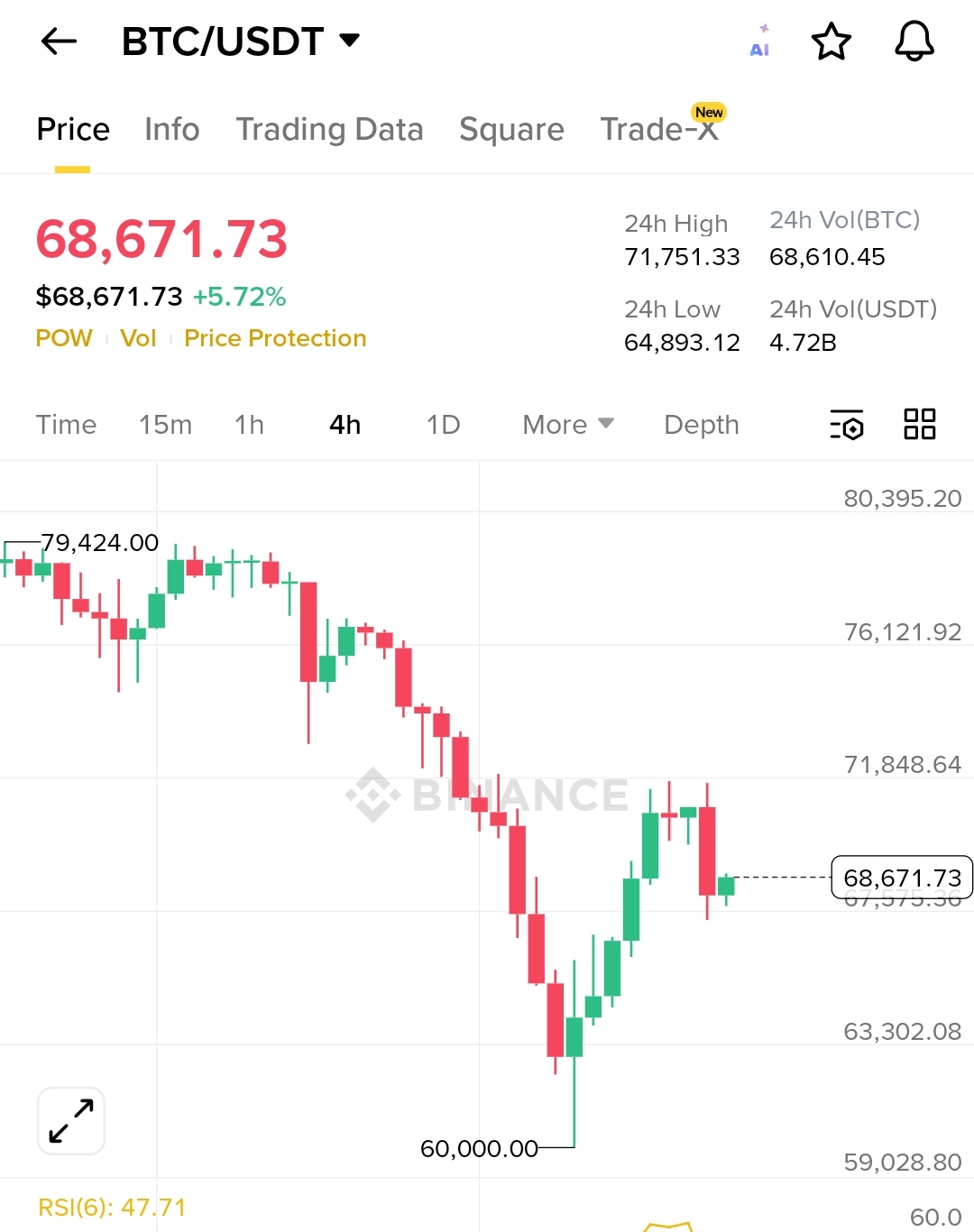 Price Action: BTC ne $60,000 ke support level se bounce back kiya hai aur filhal $68,671.73 par trade kar raha hai, jo ke +5.72% ka izafa hai.