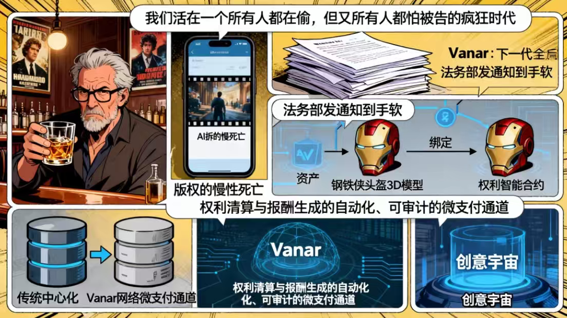 这场席卷全球创意产业的“版权失序”与“AI恐惧”,在我仔细琢磨#Vanar 的技术栈后,发现了一个可能将其引向终结的可怕可能性。Vanar或许可以成为搭建下一代 “全局可验证数字内容权利与许可协议层” 的核心组件。它要做的,不是阻止复制(这不可能),而是为数字内容的每一次使用、改编、甚至AI学习,提供一个 “权利清算与报酬生成的自动化、可审计的微支付通道”。