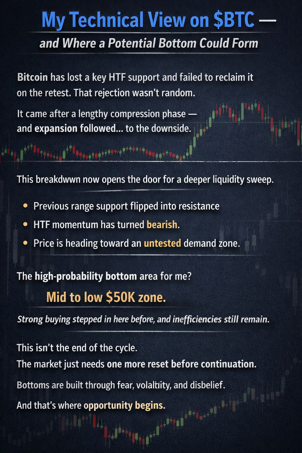 Based on structure and inefficiencies, I believe the highest-probability bottom area lies in the lower demand region — around the mid to low $50K zone. This is where strong buying previously stepped in and where unfinished business still remains.