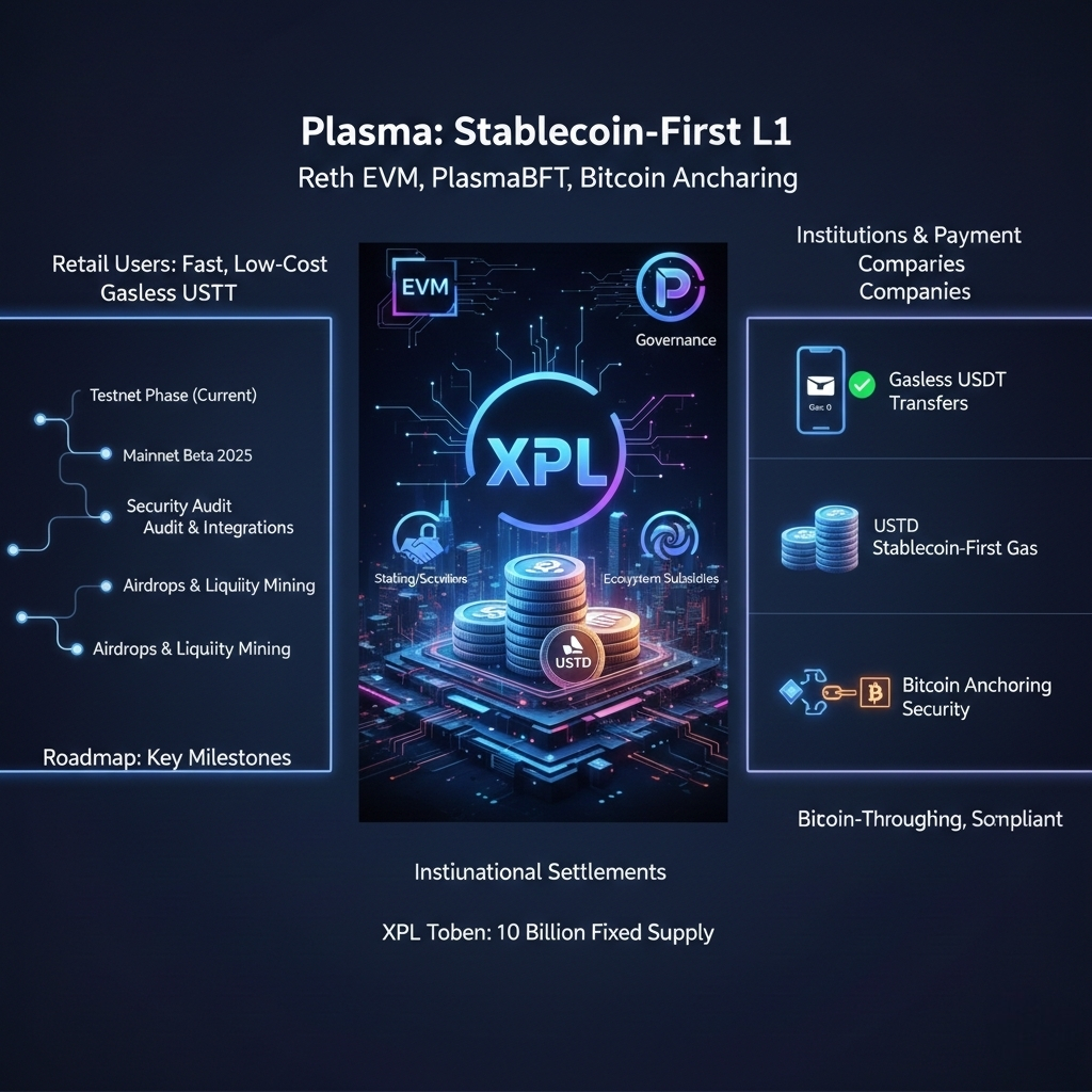 Public information shows that Plasma has entered the testnet phase and plans to launch Mainnet Beta in 2025 specific timelines may be adjusted according to development and audit progress The early focus is on completing the security audit of the consensus and cross-chain anchoring mechanisms, launching the native features of the stablecoin (such as gasless transfers), and integrating with major stablecoin issuers and payment channels. Ecosystem incentives such as airdrops and liquidity mining are used as initial user acquisition methods Please note that the roadmap details will be adjusted according to changes in the market and regulatory environment.