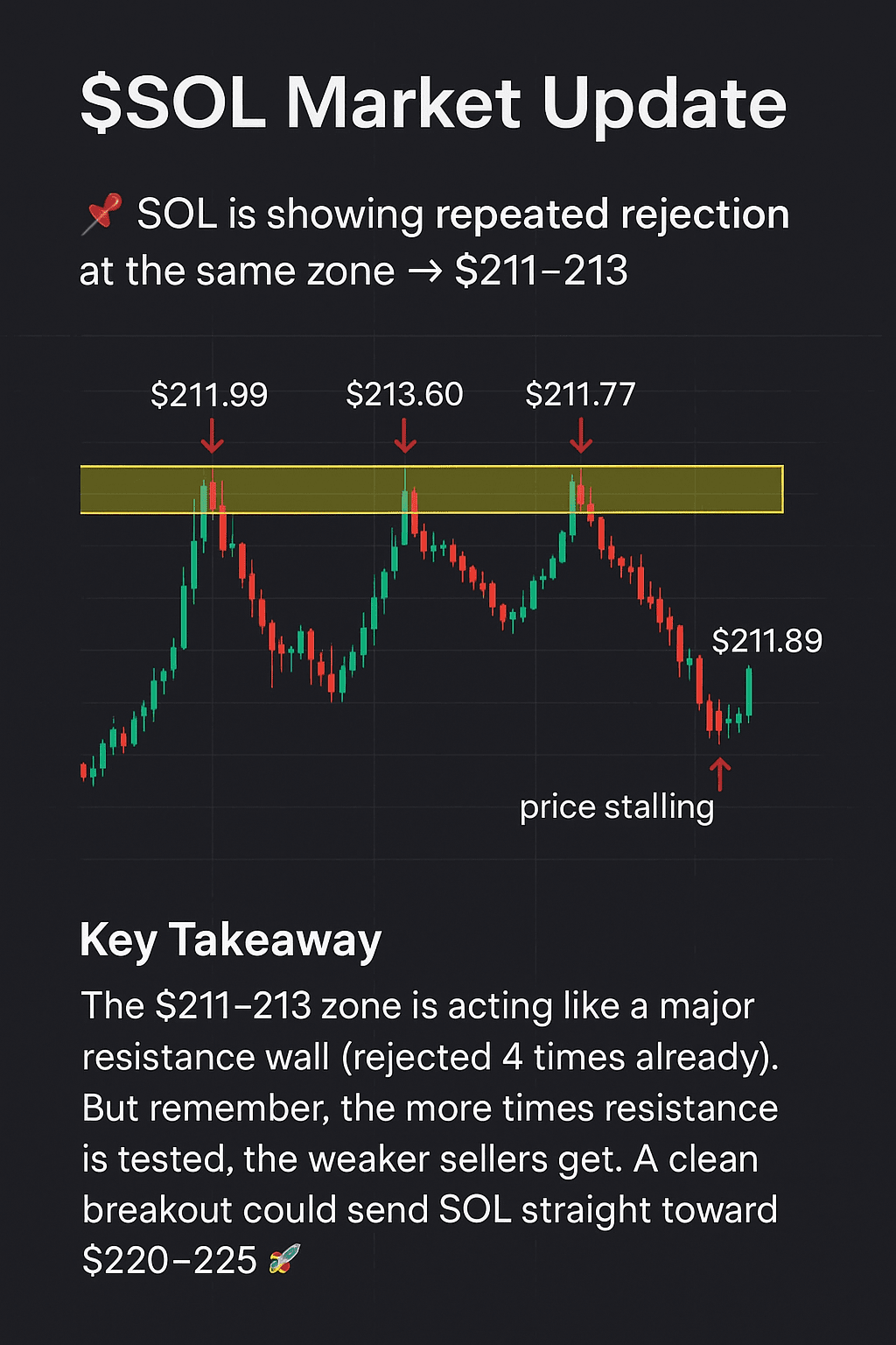 Zona $211–213 acționează ca un zid major de rezistență (respins de 4 ori deja). Dar amintiți-vă, cu cât rezistența este testată mai mult, cu atât vânzătorii devin mai slabi. Un breakout curat ar putea trimite SOL direct spre $220–225 🚀.