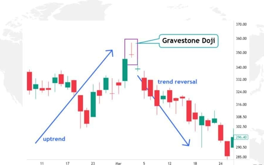 This is the natural habitat of the Gravestone Doji. After a sustained period of rising prices, its appearance signals "Buyer Exhaustion." The market tried to push higher one last time and failed. This is the classic bearish reversal signal that traders hunt for.