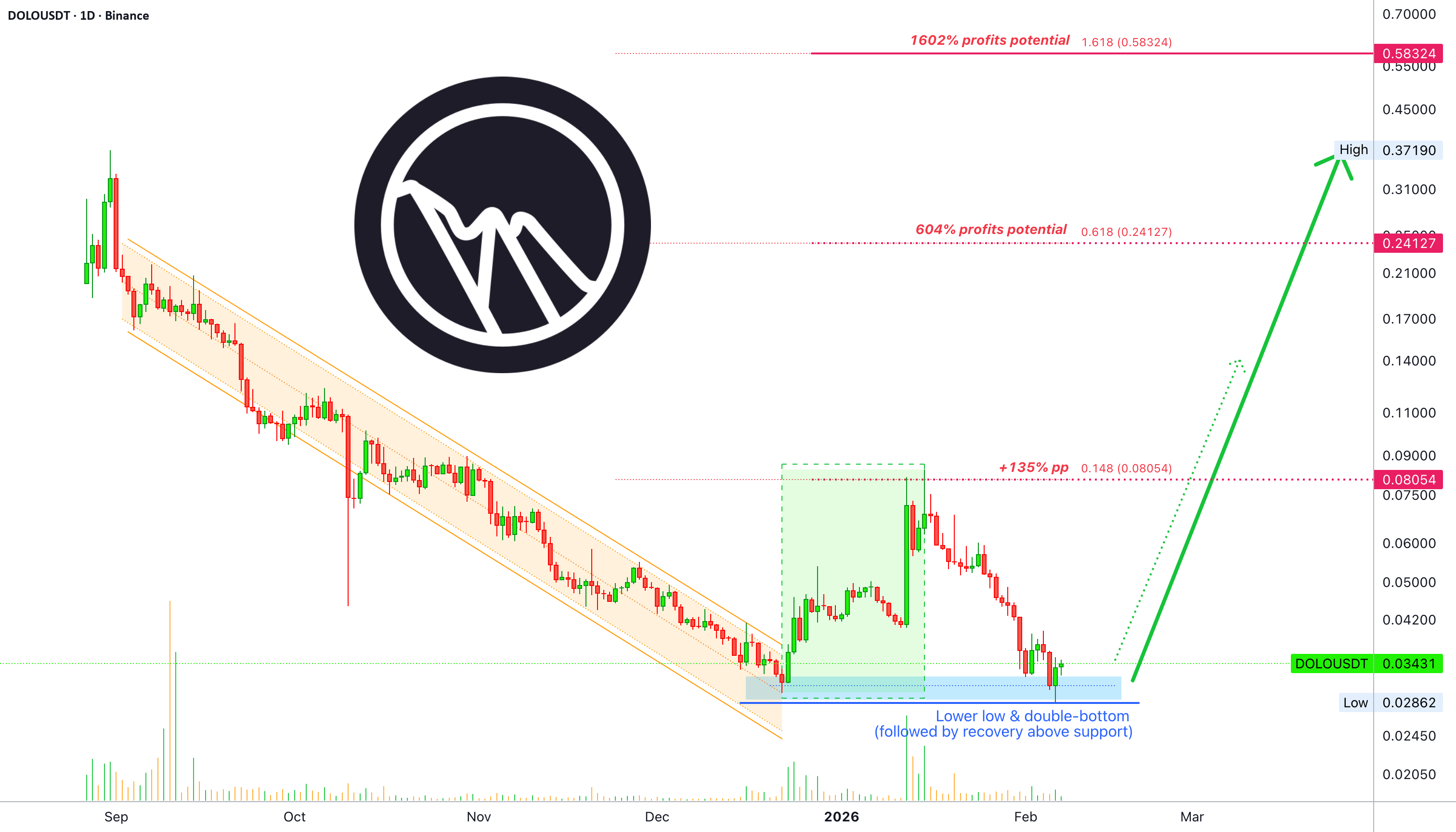 Pentru DOLOUSDT, minimul anterior istoric s-a întâmplat pe 22-Decembrie 2025 la 0.02993. Minimului de ieri, 6-Februarie 2026, s-a întâmplat la 0.02862. Un minim mai timid, un dublu fund clasic. Dublul fund este un semnal de inversare bullish.