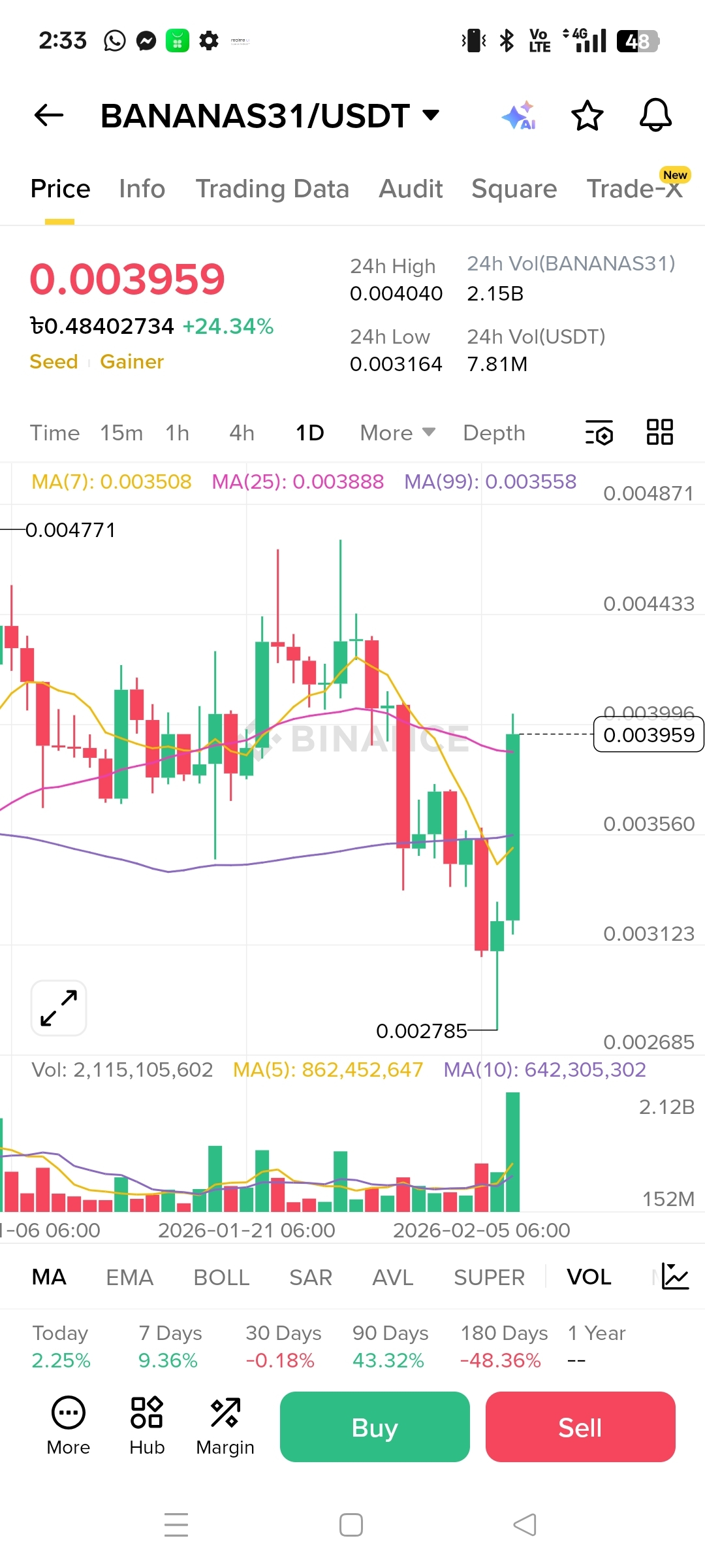 \u003cc-29/\u003e (Banana For Scale, moneda meme pe lanțul BNB inspirată de gluma clasică "banana for scale") arată semne de viață pe graficul 1D după acea scădere brutală. În acest moment, prețul se află în jur de 0.003959, recuperându-se puternic de la minimul recent aproape de 0.002785 cu o mare lumânare verde de recuperare susținută de un volum serios crescut. Aceasta arată ca un impuls de reversare din manual—vânzătorii s-au epuizat, cumpărătorii au intervenit puternic, și acum recuperează zona MA(25) (~0.003888) pe cadrul zilnic. Fiind un câștigător/meme marcat cu Seed, volatilitatea este inclusă, așa că așteptați mișcări rapide, dar structura tinde să fie optimistă dacă momentum-ul se menține.
