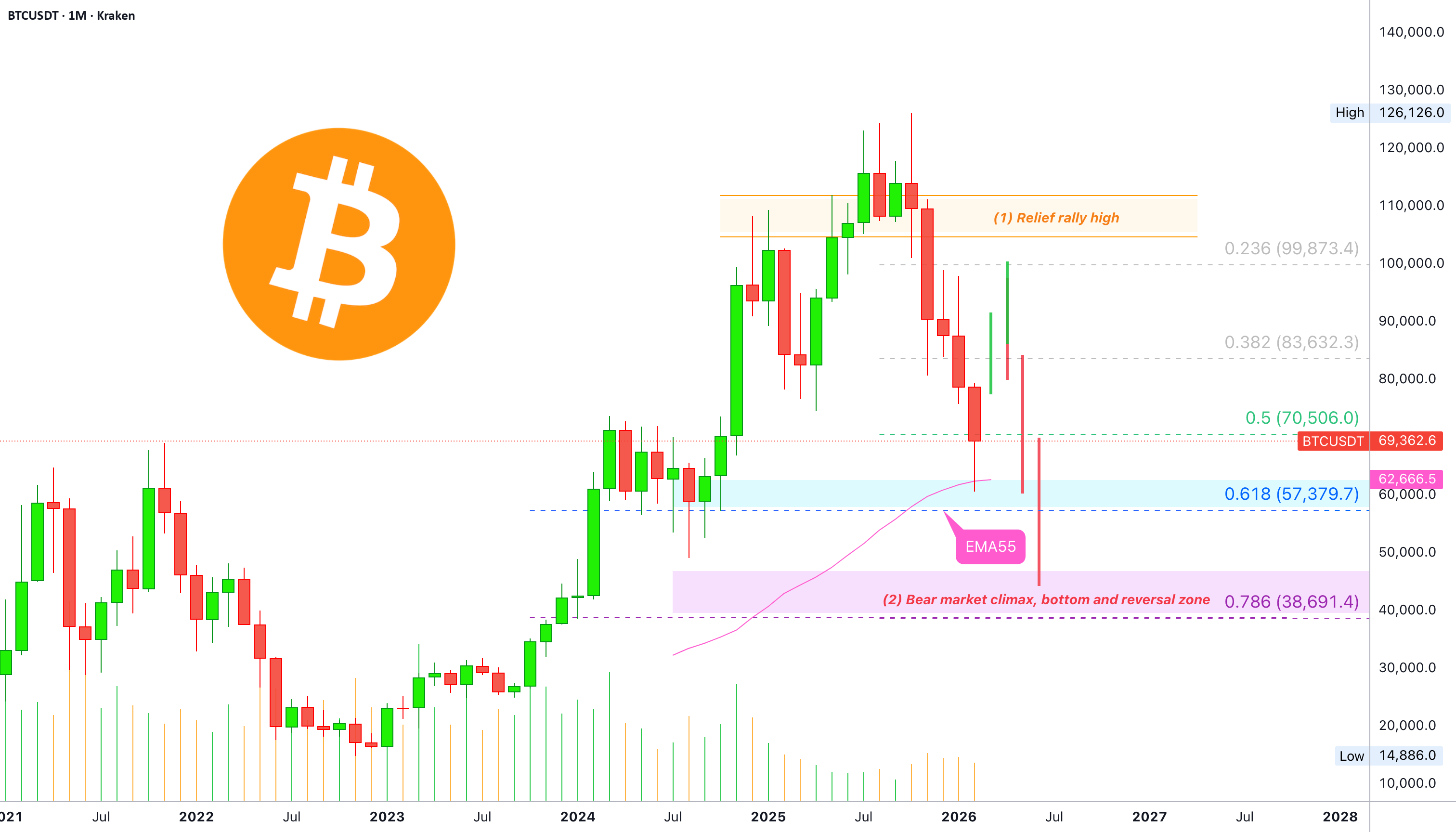 وجد البيتكوين دعمًا على الإطار الزمني الشهري عند EMA55، متداولًا لمدة خمسة أشهر متتالية باللون الأحمر. دافع هابط قوي جدًا. هذا هو الليل، والآن يأتي النهار.