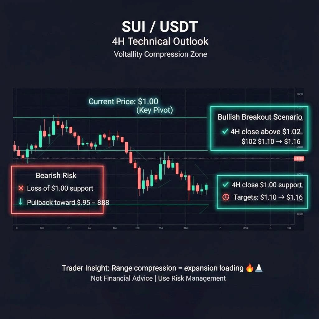 $SUI este în prezent tranzacționat în jurul valorii de $1.00, arătând semne de stabilizare după o vânzare rapidă de la maximul de $1.16 la minimul de capitulare de $0.78. Pe intervalul de 4 ore, prețul a format o recuperare clară în formă de V, urmată de o gamă strânsă de consolidare, care adesea acționează ca o platformă de lansare pentru următoarea mișcare impulsivă.