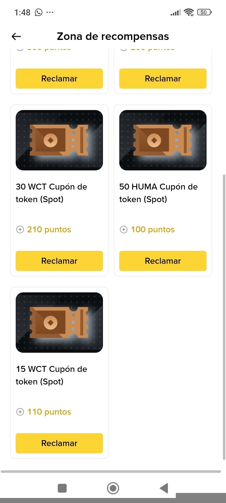 50 $HUMA o 15 $WTC Si tengo 120 puntos y voy a cambiar o reclamar mi recompensa que me conviene en éstos momentos 🤔