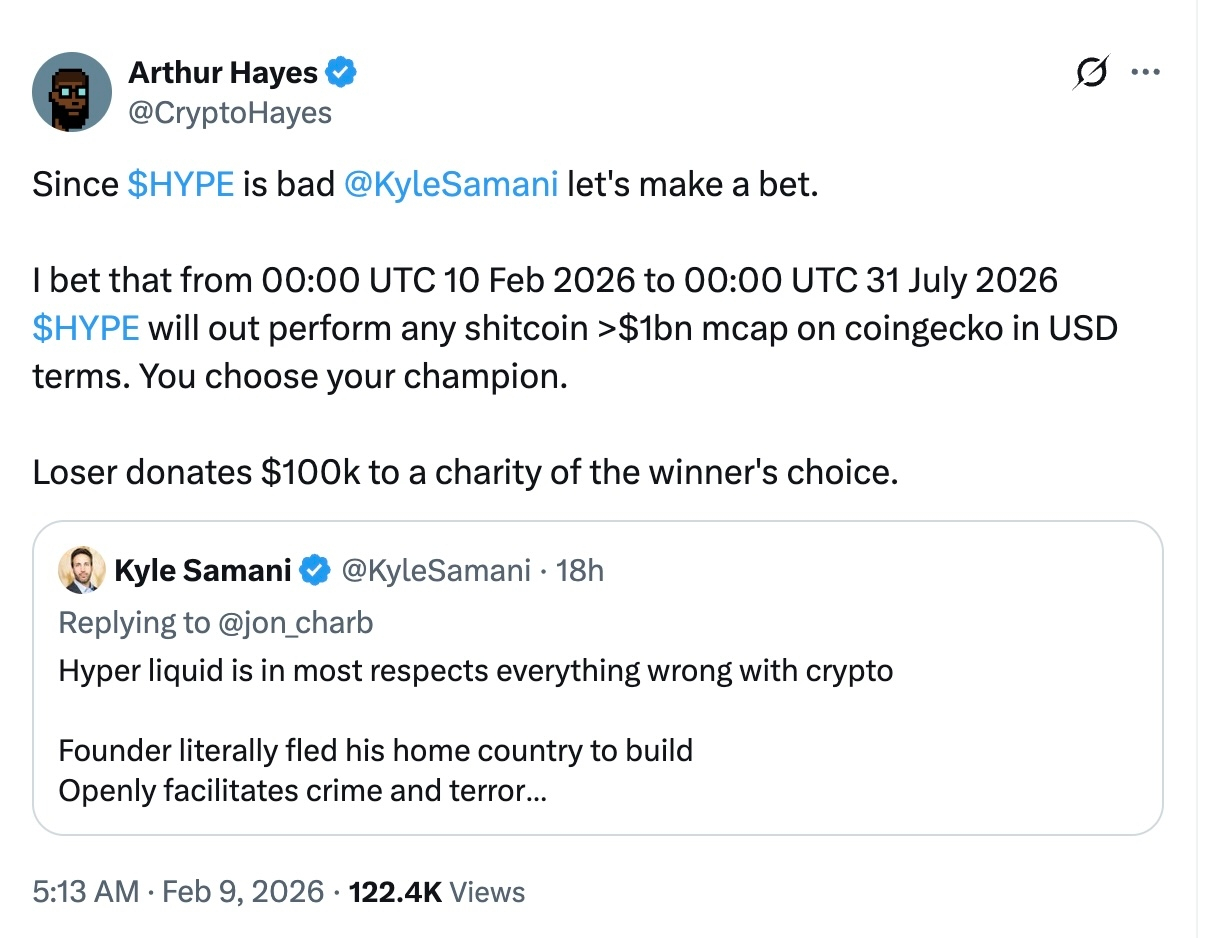 Arthur Hayes, nhà sáng lập sàn phái sinh crypto BitMEX, vừa gây chú ý khi công khai thách Kyle Samani, đồng sáng lập quỹ Multicoin Capital, tham gia một kèo cá cược trị giá 100.000 USD xoay quanh token HYPE của dự án Hyperliquid.