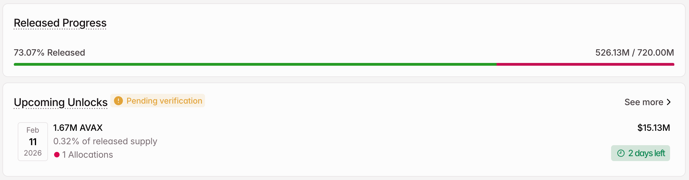 Vào ngày 11 tháng 2, Avalanche sẽ phát hành 1,67 triệu token, với giá trị ước tính khoảng 15,13 triệu USD, tương ứng 0,32% nguồn cung lưu hành.