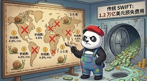 🔍 [本质] 企业被锁死在 SWIFT 体系里,不是因为它好,而是因为「全行业都在用」——这就是路径依赖。跨境支付 3-5 天到账,每次抽成 3-7%,但企业没有选择。