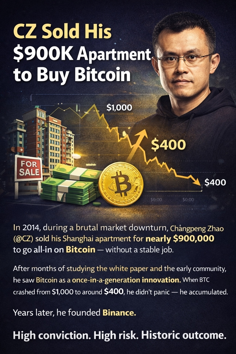 In 2014, during a brutal market downturn, Changpeng Zhao (@CZ) sold his Shanghai apartment for nearly $900,000 to go all-in on Bitcoin — without a stable job.
