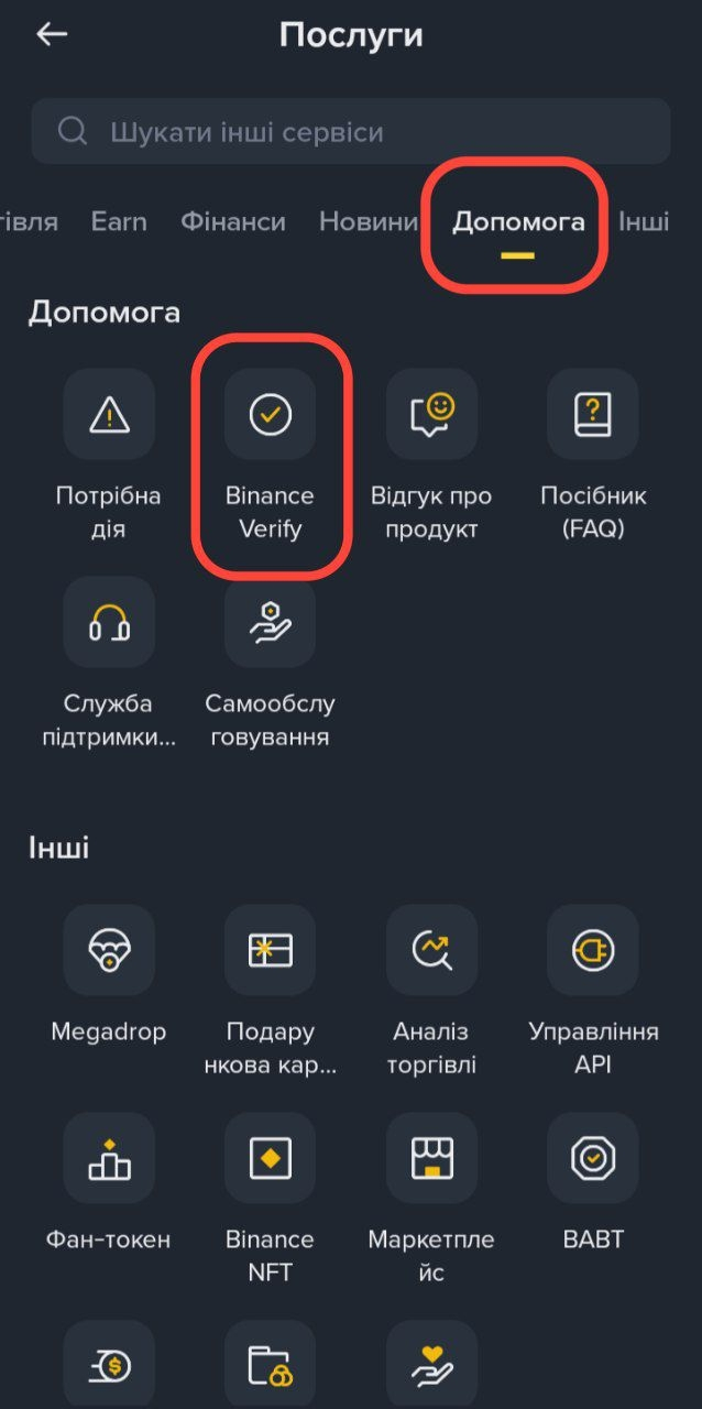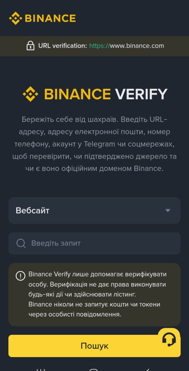 "Ваша перша лінія оборони знаходиться тут: Послуги -> Допомога -> Binance Verify"