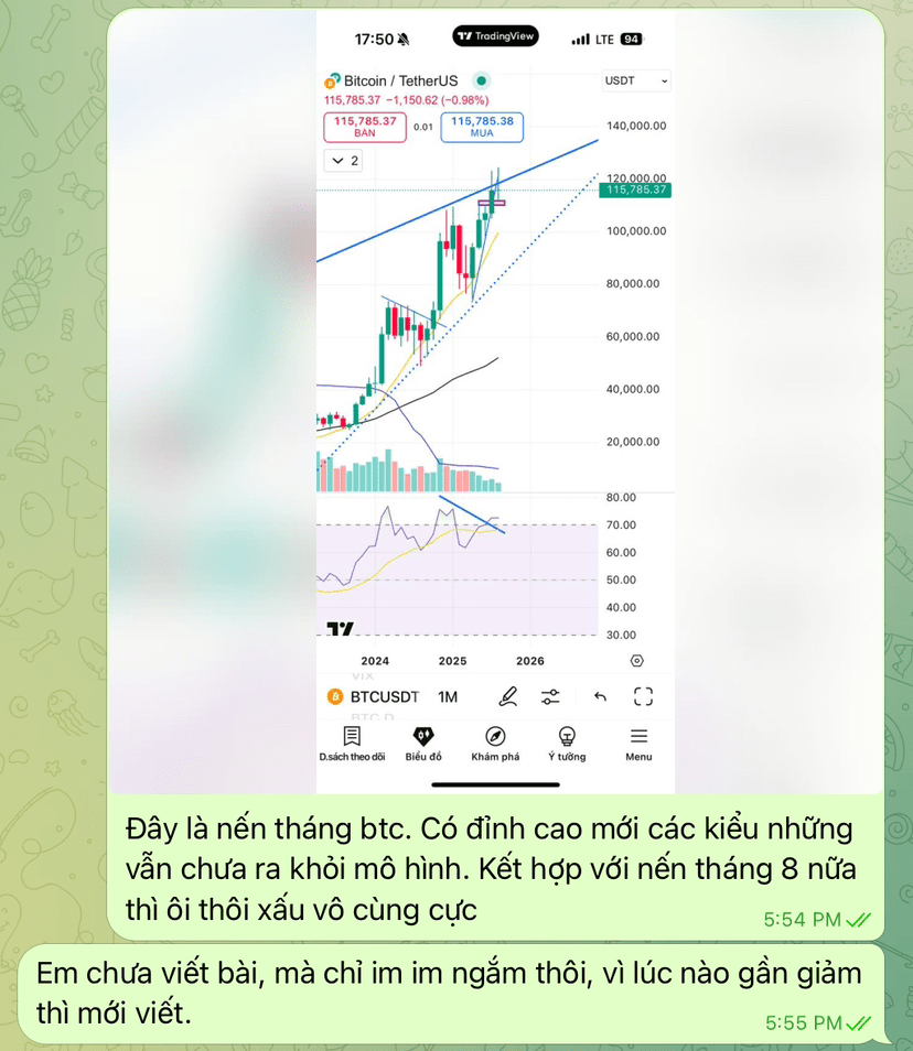 Atunci, toată lumea încă striga despre ALTSS, iar BTC era la 130k - 150k. Câteva ALTCOIN-uri tocmai crescuseră puternic, așa că erau speriați de „cumpărarea rapidă că se termină monedele”. Când BTC a scăzut la 115k, „COPACII SUBȚIRI” strigau că va fi o ajustare ușoară și desenau câteva lumânări pe 4h, lumânări pe 1D care să crească brusc la 130k. În timp ce lumânările pe W, M arătau foarte prost, nimeni nu părea să observe. Pentru că, în esență, ceea ce oamenii au nevoie nu este să ajute să câștige mulți bani, să înțeleagă tendința pieței, ci ceea ce ei au nevoie este să tranzacționeze constant pentru a putea câștiga comisioanele de la voi.