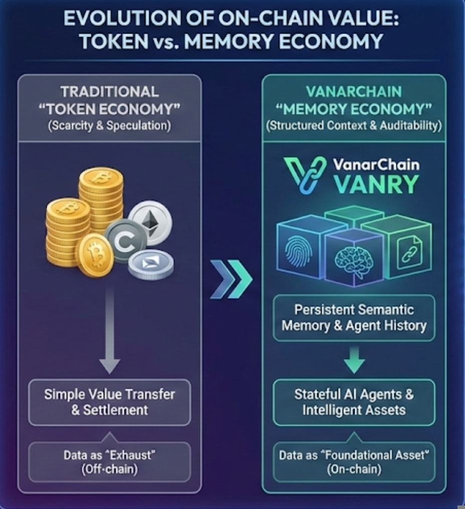 That’s where the idea of a memory economy starts to feel different. And when I first looked closely at what VanarChain is building, what struck me wasn’t speed or branding. It was this quiet shift underneath. The suggestion that stored intelligence, structured memory, and contextual data might become as foundational as tokens themselves.