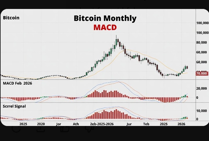 Iată o analiză și o reprezentare actuală a graficului MACD lunar pentru Bitcoin (BTC/USD) la mijlocul lunii februarie 2026. Bitcoin se tranzacționează în jurul valorii de 69,000–70,500 USD (cu închideri recente în intervalul de 68k–70k pe diverse burse precum Bitstamp/Coinbase). Starea MACD lunar (setări 12, 26, 9 – standard)