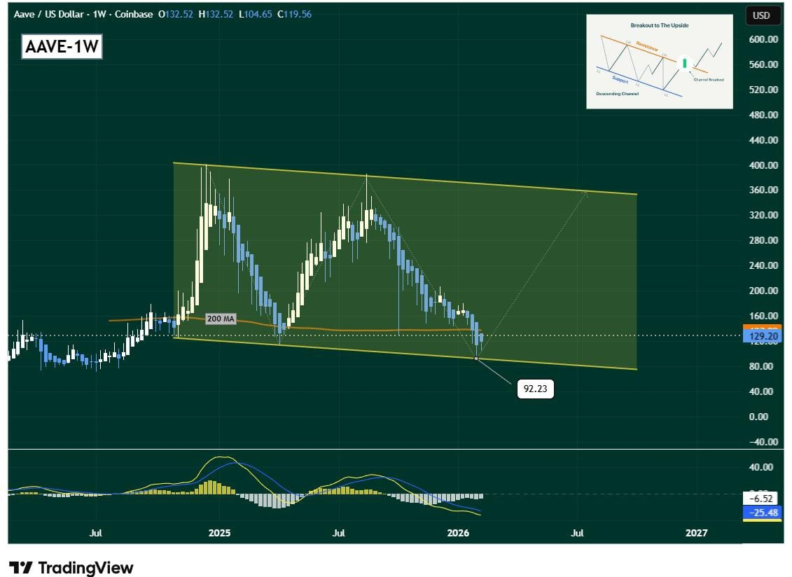 Pe intervalul de timp săptămânal, AAVE se tranzacționează într-un canal descendent — o structură formată din două linii de trend paralele, înclinate în jos, care apare adesea în timpul fazelor corective extinse.