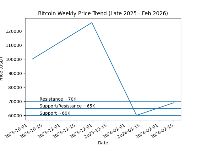 Acum? BTC a avut o revenire solidă, tranzacționând în jur de $68,500–$69,000 astăzi (16 feb), cu unele impulsuri intraday testând din nou $70K+.