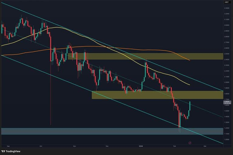Cu toate acestea, revenirea se apropie acum de linia de tendință de mijloc a canalului, o zonă de rupere anterioară aproape de $1.75–$1.85, care a acționat anterior ca suport și acum s-a transformat în rezistență. Atâta timp cât activul rămâne sub această zonă de $1.80, biasul mai larg rămâne corectiv într-o tendință bearish. O închidere zilnică deasupra $1.85 ar deschide calea către următoarea ofertă majoră la $2.40–$2.50, în timp ce respingerea din această zonă ar putea trimite prețul înapoi spre $1.20 din nou.