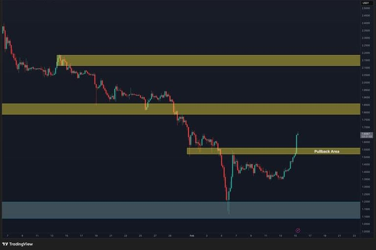 Pe intervalul de timp de 4 ore, recuperarea pare mai impulsivă, cu lumânări puternice de creștere revendicând zona de ofertă pe termen scurt din jurul $1.50–$1.55. Activul a avansat în regiunea $1.65–$1.80, care se aliniază cu oferta minoră intraday și limita inferioară a intervalului anterior de consolidare. Cu toate acestea, a fost respins acolo și adus înapoi la punctul său de plecare.