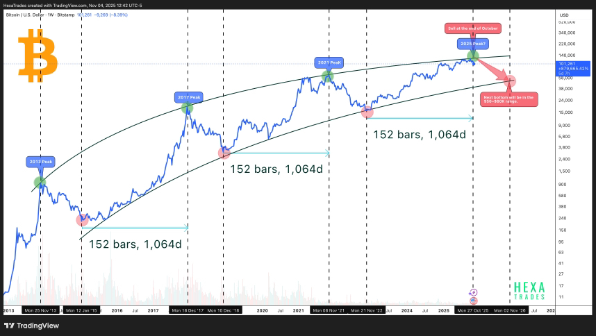 Якщо подивитися на 4-річні цикли біткоїна (halving → bull → top → bear → bottom), то після піку пост-халвінгового циклу дно зазвичай формується на рівні -75…-85% від ATH або в зоні сильної підтримки за попередніми циклами.