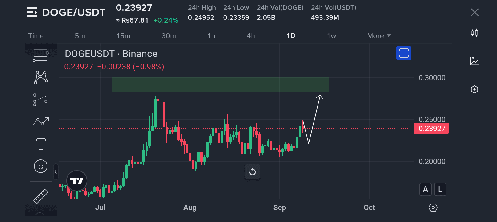 În ultimele câteva săptămâni, Doge a fost tranzacționat într-un interval, oscillând între suportul de 0.23 și rezistența de 0.25. Testele repetate ale rezistenței sunt semnificative — ele sugerează adesea că cumpărătorii se pregătesc pentru o potențială spargere.