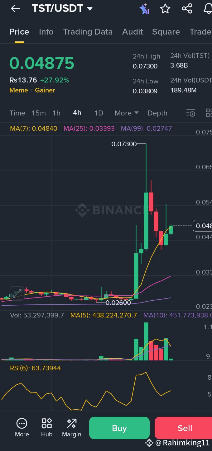 With a trading volume of 3.68 billion TST and over 189 million USDT exchanged, market interest is clearly rising. Technical indicators reflect bullish strength— the RSI is around 63.7, suggesting healthy momentum without being overbought. The moving averages (MA7 at $0.04840 and MA25 at $0.03393) confirm the short-term uptrend.