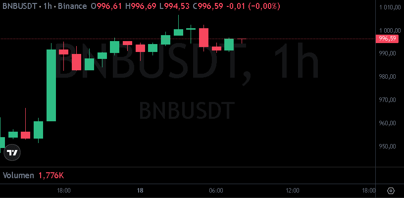 Conform datelor de la CoinMarketCap, BNB a ajuns astăzi până la $1,004.82, un +4,51% în 24 de ore, după ce a decolat de la un minim zilnic de $947.77. Volumul de tranzacționare a crescut în paralel, urcând cu 15,22% până la $3.87 miliarde, semn că apetitul investitorilor rămâne intact.