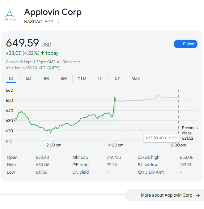 Starea actuală: Pe 20 septembrie 2025, acțiunile AppLovin au închis la 649,59 USD pe NASDAQ, urmând o tendință ascendentă accentuată și constantă.