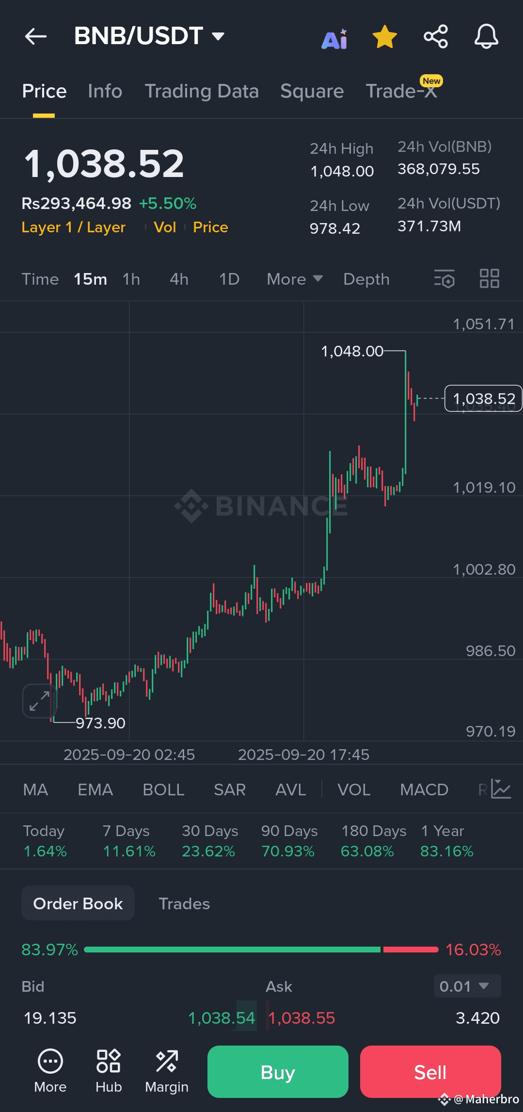 At the time of analysis, BNB/USDT is trading at $1,038.52, reflecting a +5.50% daily increase. In PKR terms, this equals approximately Rs. 293,465.