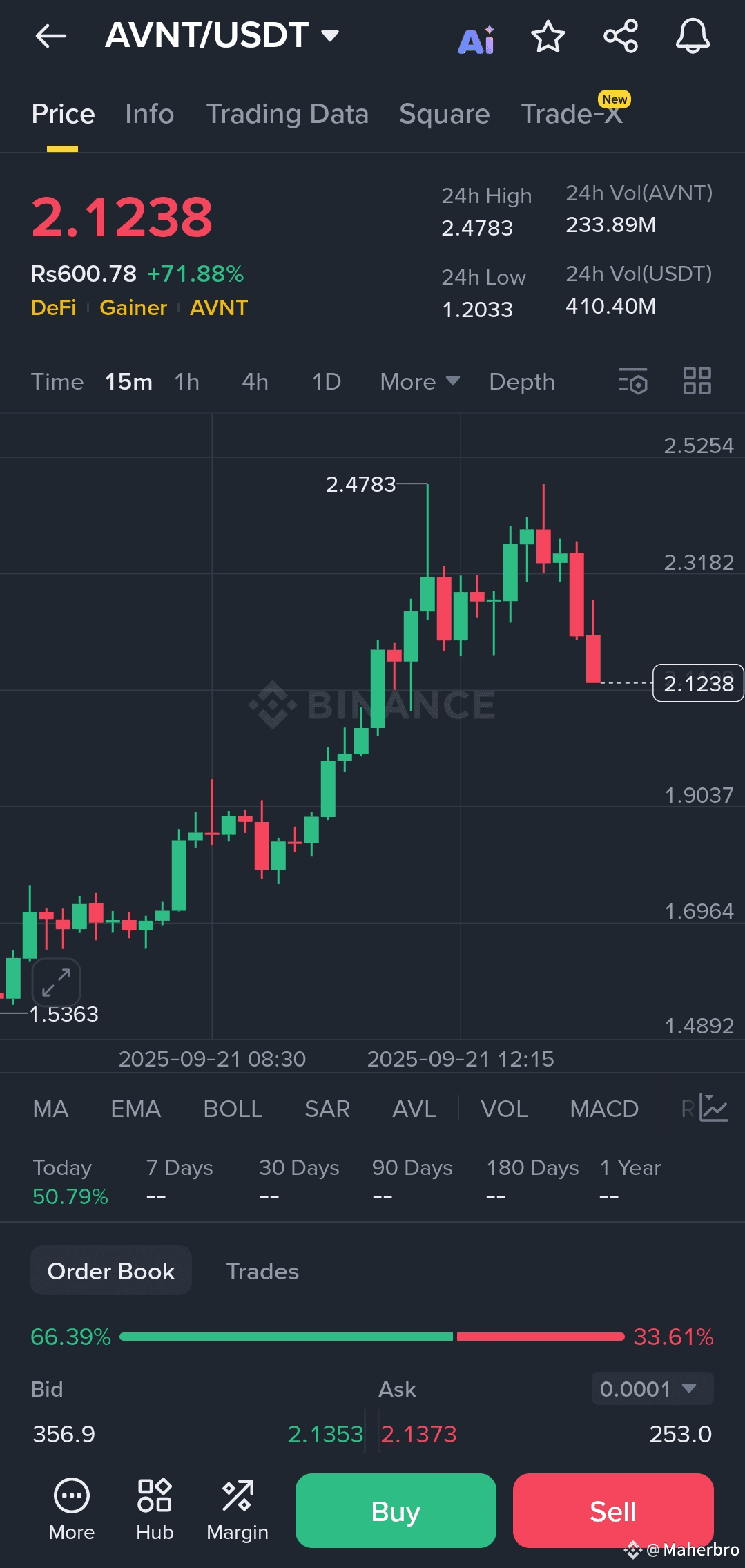 AVNT is exhibiting exceptionally strong bullish momentum, currently trading at 2.1238 USDT with a staggering intraday gain of +71.88%. This performance crowns it as a top "DeFi Gainer." The price is trading near the upper end of its daily range, backed by massive volume, indicating powerful buying pressure. However, such extreme moves also warrant caution for a potential pullback.
