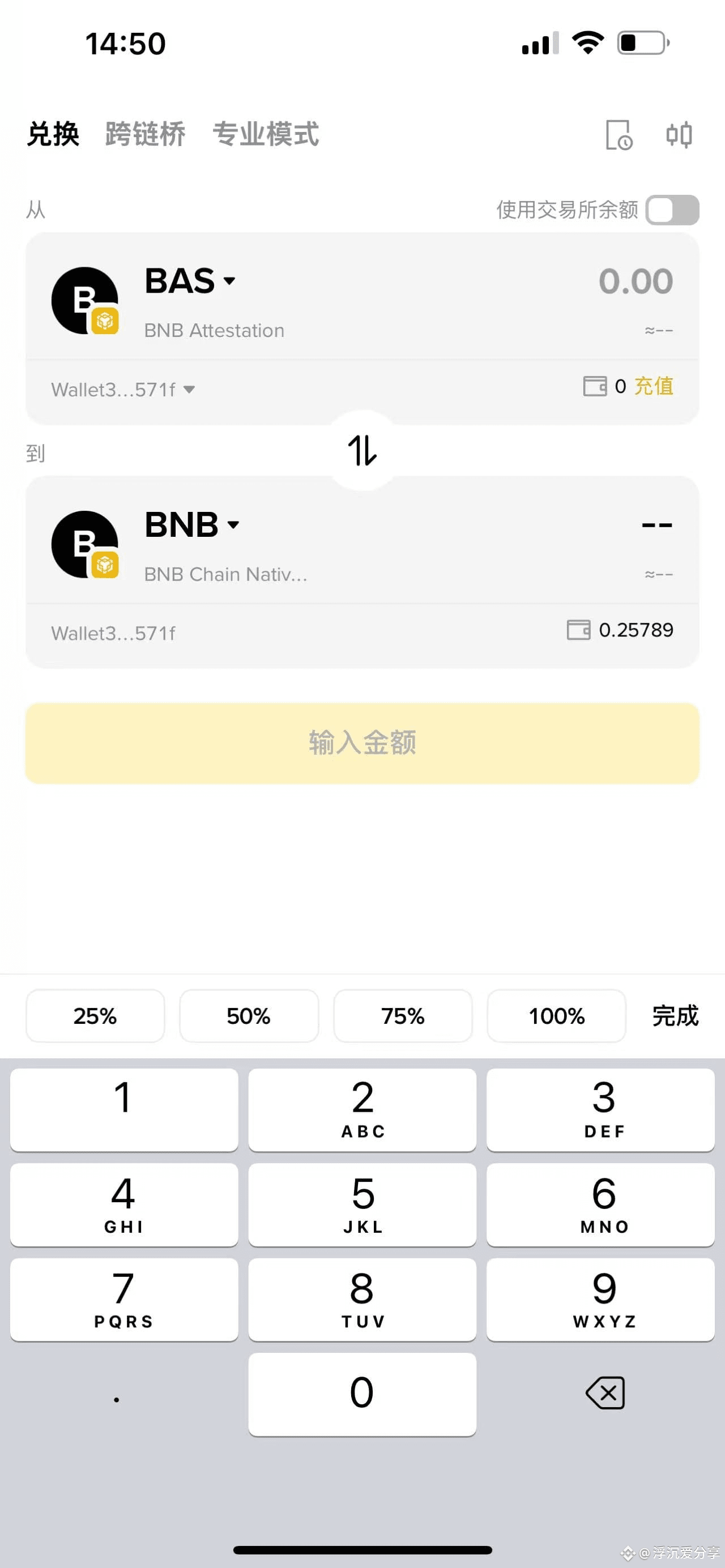 ①先在币安钱包中兑换3000以上的BAS代币,然后再购买0.105左右的BNB(这里可以根据你的实际情况调整,例如你的钱包已经有0.105个BNB了,你可以分两次买入总共3000个BAS代币,币安钱包有大于两次交易即可)