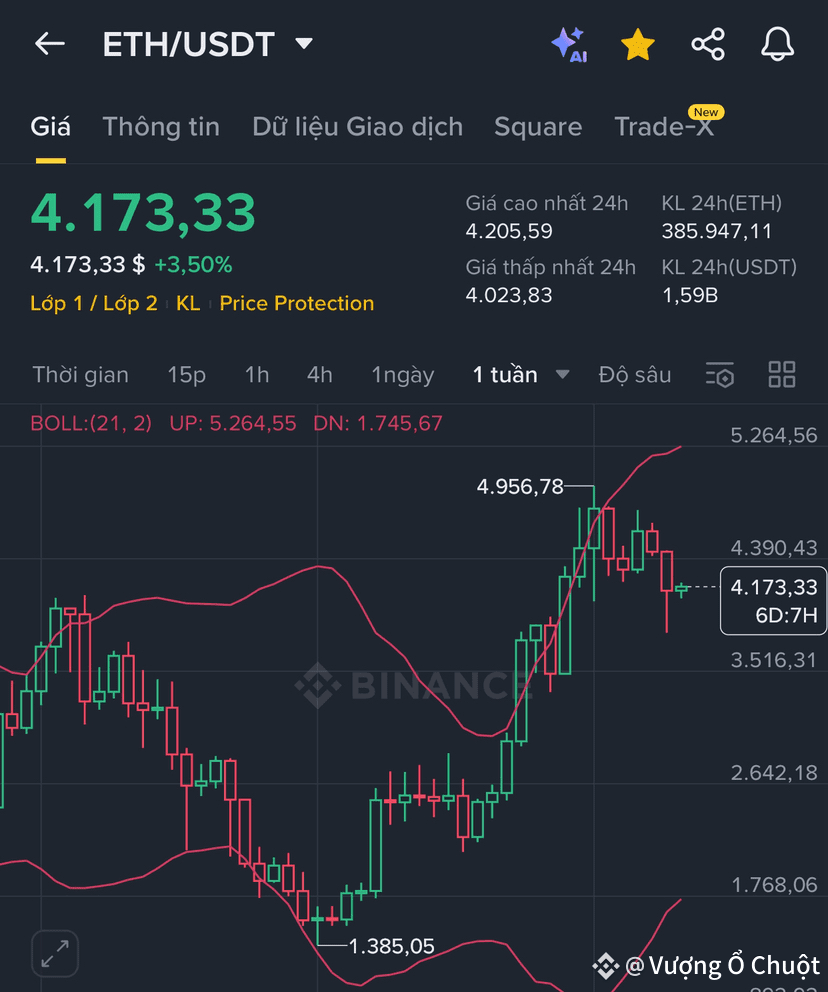 ETH hiện giao dịch quanh mức 4169.17 USDT, đang tiến sát ngưỡng kháng cự quan trọng 4300 USD.