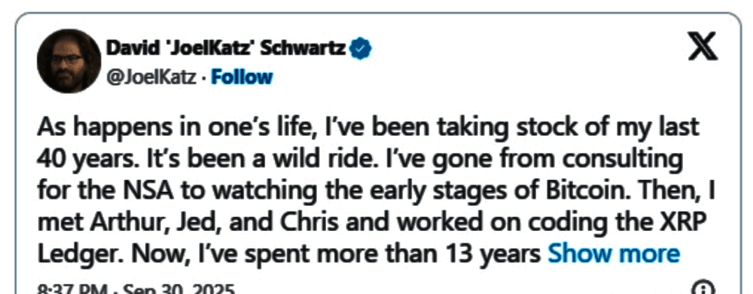 CTO-ul de lungă durată al Ripple, David Schwartz, a anunțat că se va retrage din operațiunile zilnice la sfârșitul anului, după mai mult de un deceniu în care a modelat XRP Ledger. El va rămâne în Consiliul Ripple ca CTO Emeritus, în timp ce va urmări, de asemenea, noi proiecte și obiective personale.